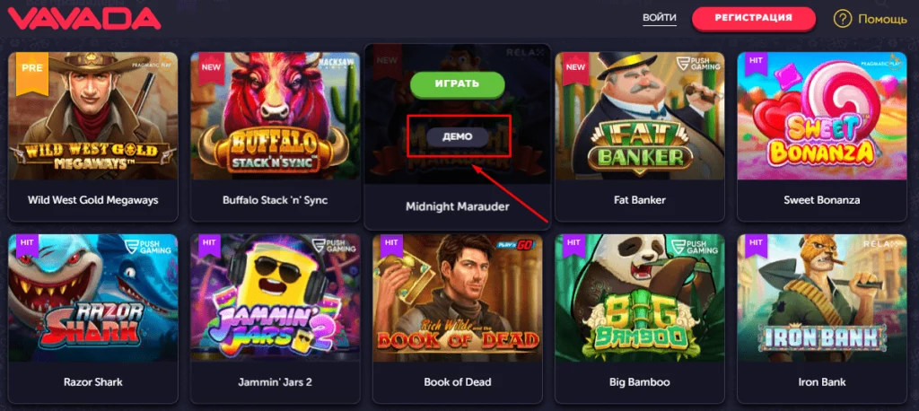 Сайт Вавада представляет 3000 игровых автоматом, каждый из которых прошёл проверку соответствия стандартам Curacao. Автоматы от ведущих студий, таких как NetEnd, Microgaming, Novomatic, Ganaparty и другие, доступны в лобби казино. Список поставщиков игр регулярно обновляется. Играть в слоты можно как бесплатно, так и на реальные деньги. Для начала тестовой игры нужно выбрать желаемый автомат в лобби казино. Наведите мышку на аппарат, который вам понравился, и нажмите на кнопку «демо».